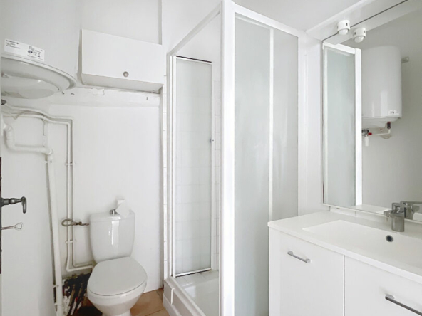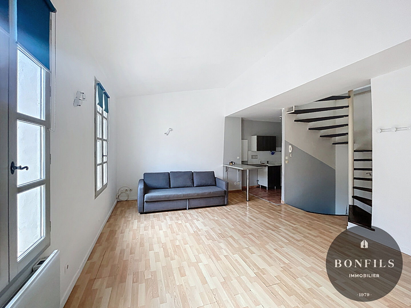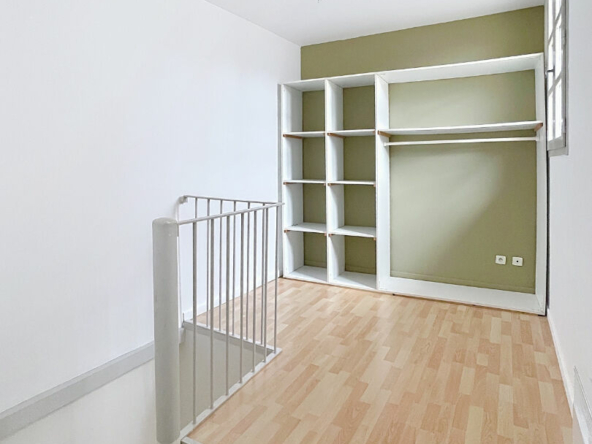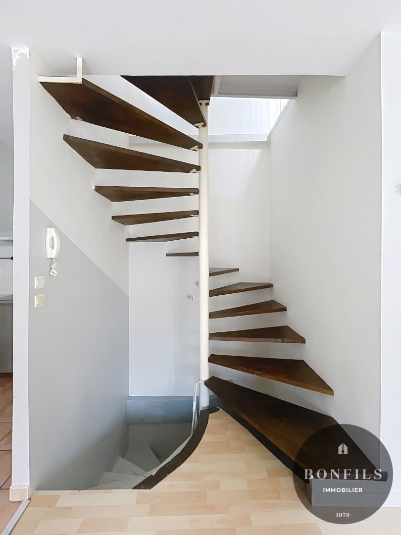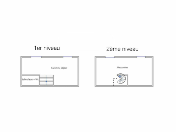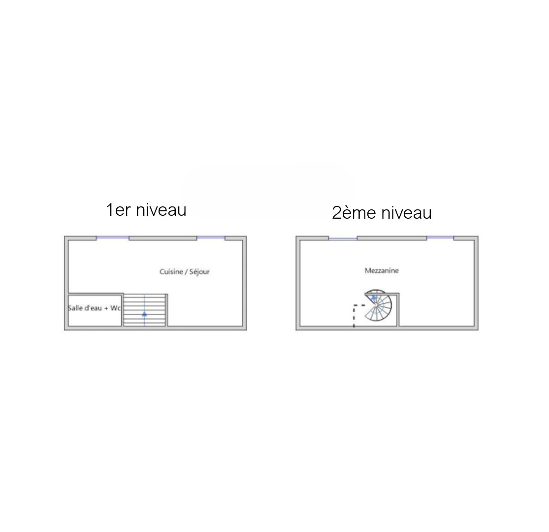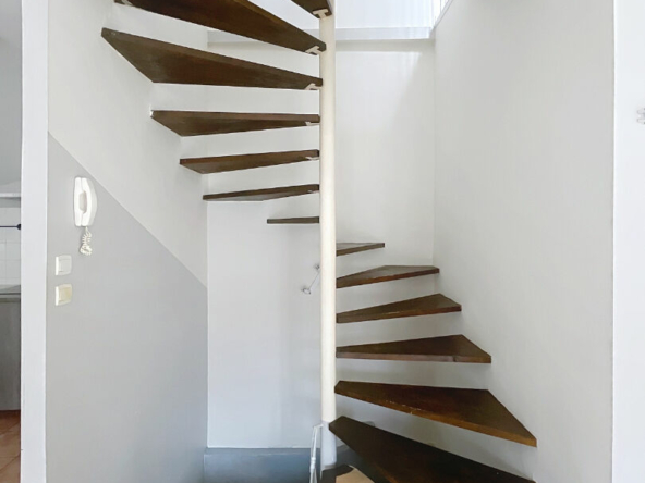 L’appartement, en duplex, occupe le second et dernier étage de l’immeuble. L’entrée se situe au 1er étage, puis un escalier privé mène au séjour avec cuisine ouverte (plaques de cuisson, hotte, réfrigérateur-congélateur) d’environ 28 m² ainsi qu’à la salle d’eau avec WC.