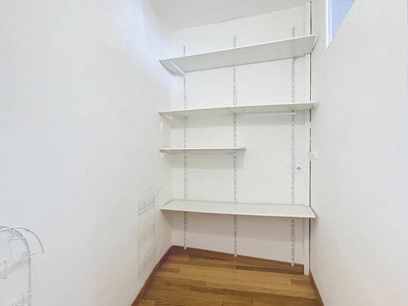 Il se compose d’un hall d’entrée, d’un séjour exposé Est, de deux chambres, d’une grande cuisine indépendante équipée (plaques de cuisson, hotte et four) avec accès à une loggia couverte, ainsi que d’une véritable pièce dédiée au rangement attenante à la cuisine, et d’une salle de bains avec WC.