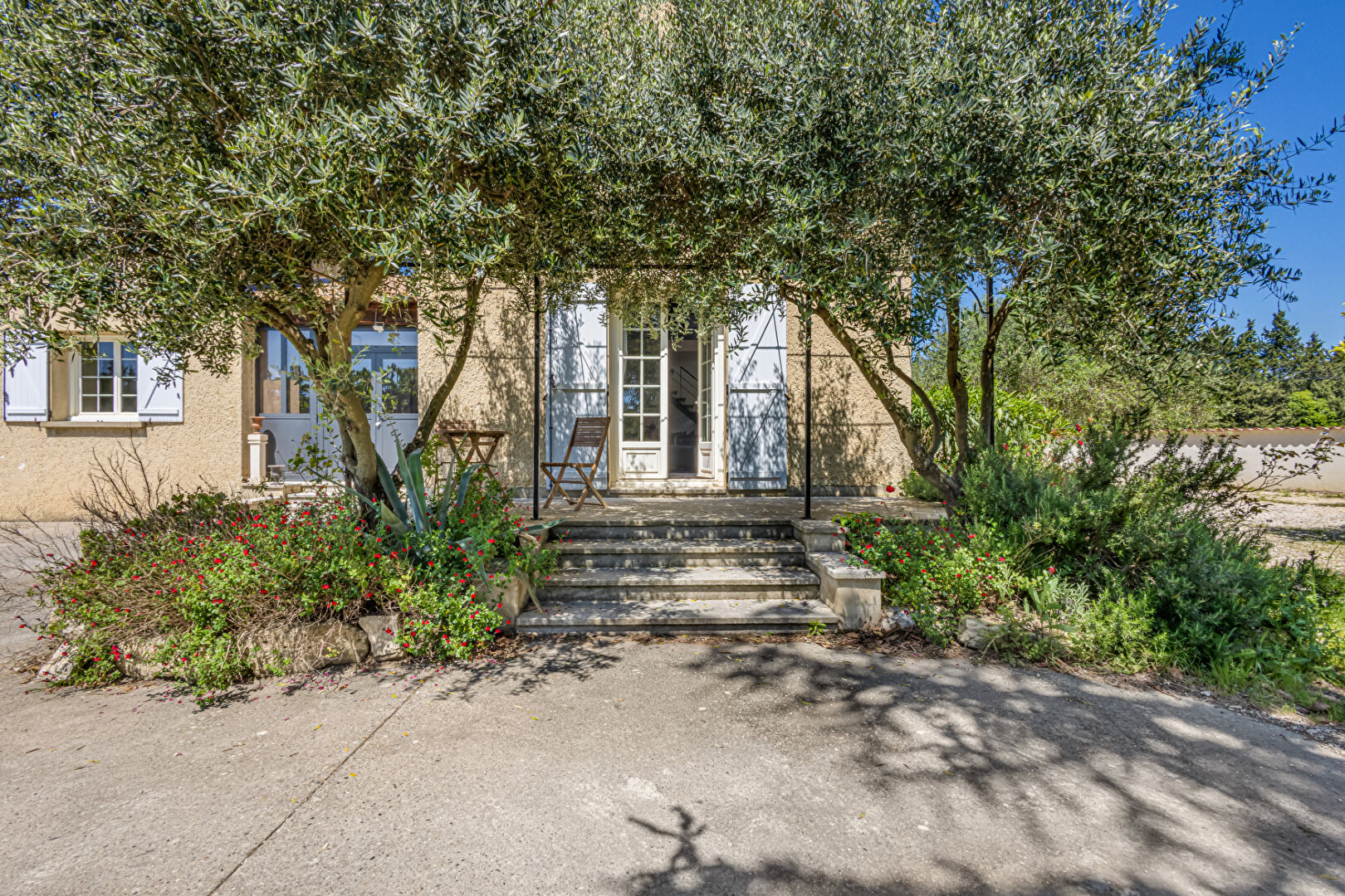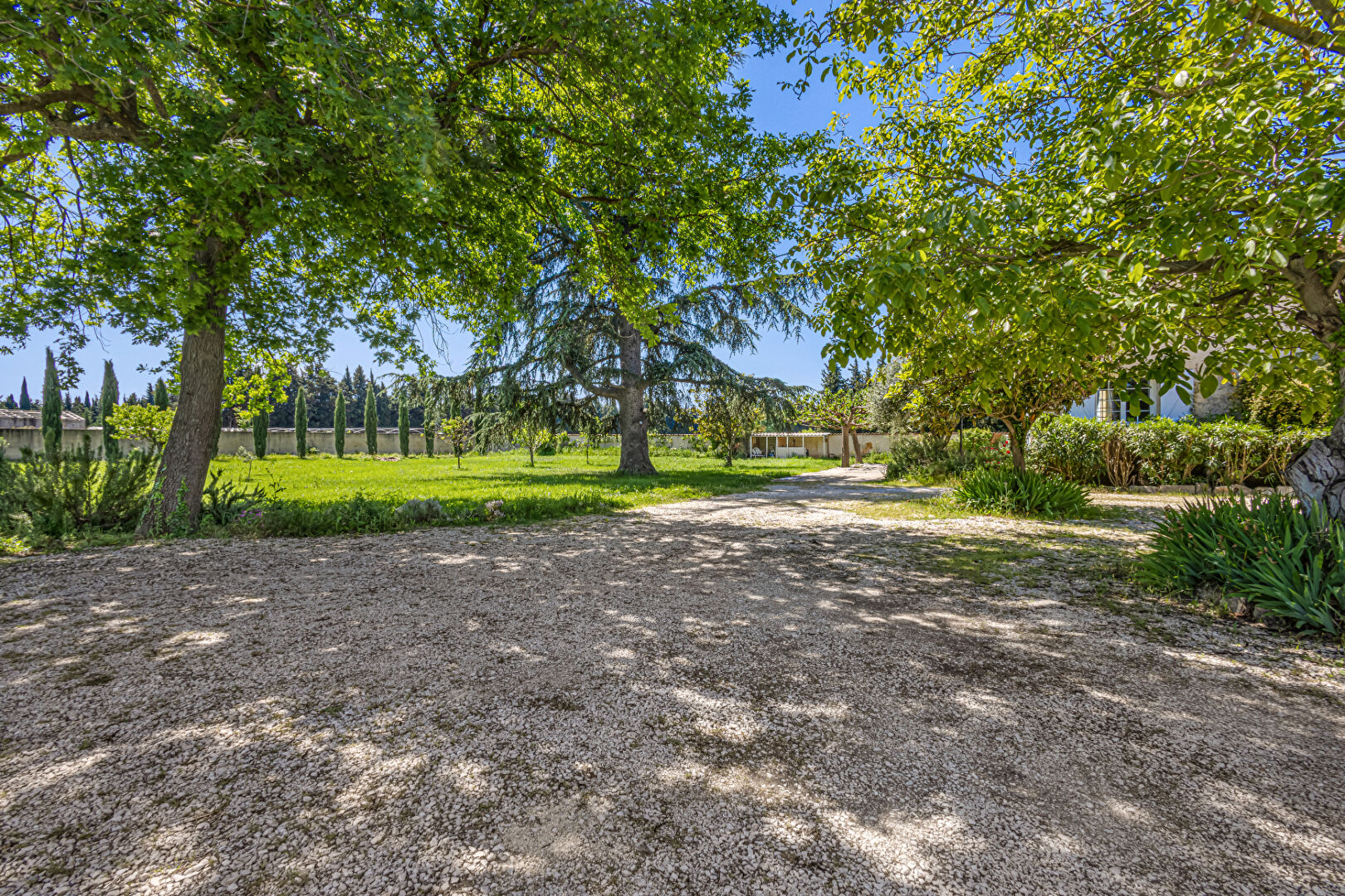 Le terrain est arboré, vivant, propice à la détente, vaste, 3 300 m² , planté de beaux arbres d’essence locale et ornementale : un cèdre majestueux, un chêne, des oliviers, néfliers, un noyer, autant d’arbres qui structurent un espace à la fois fonctionnel et relaxant.