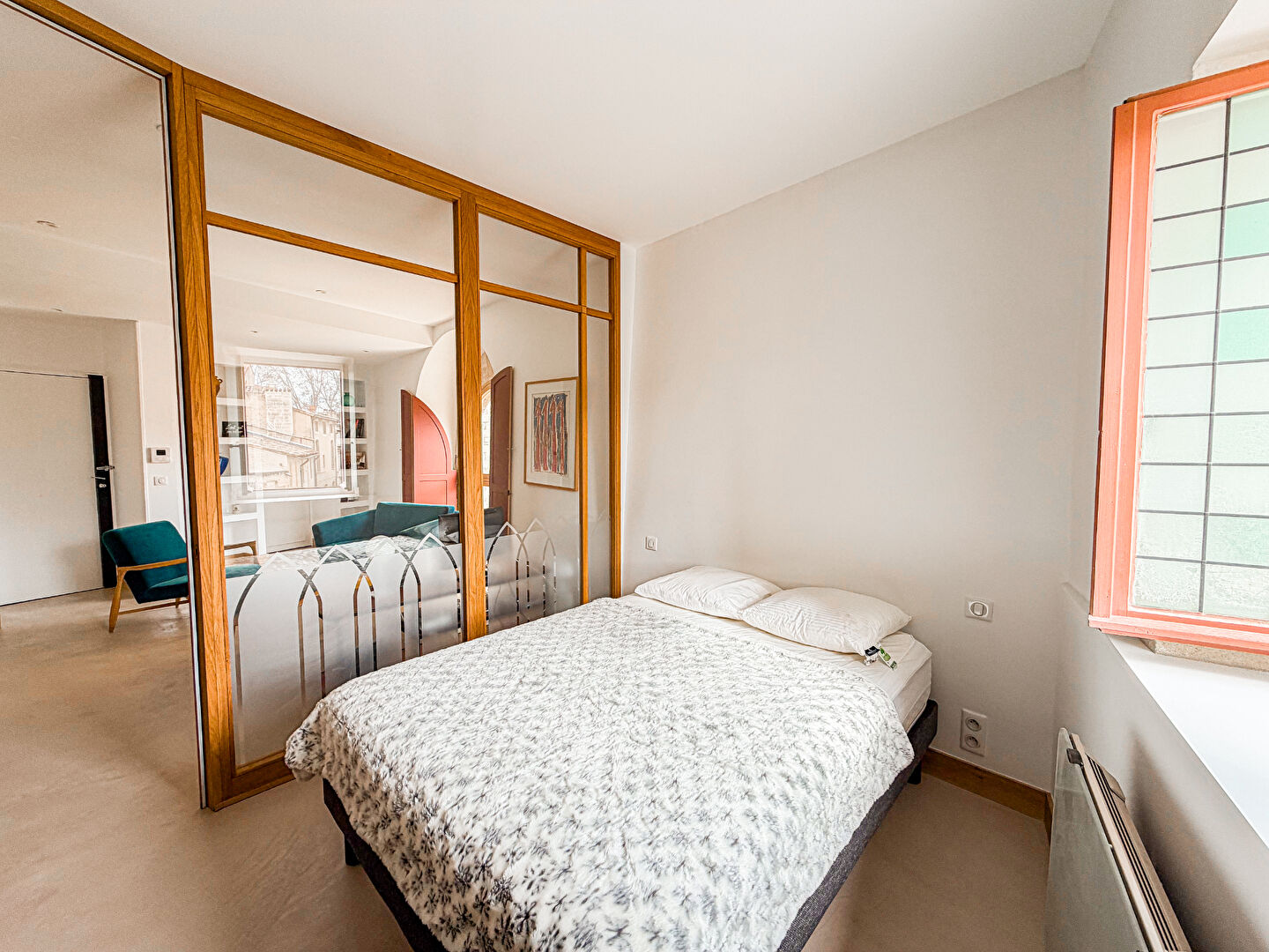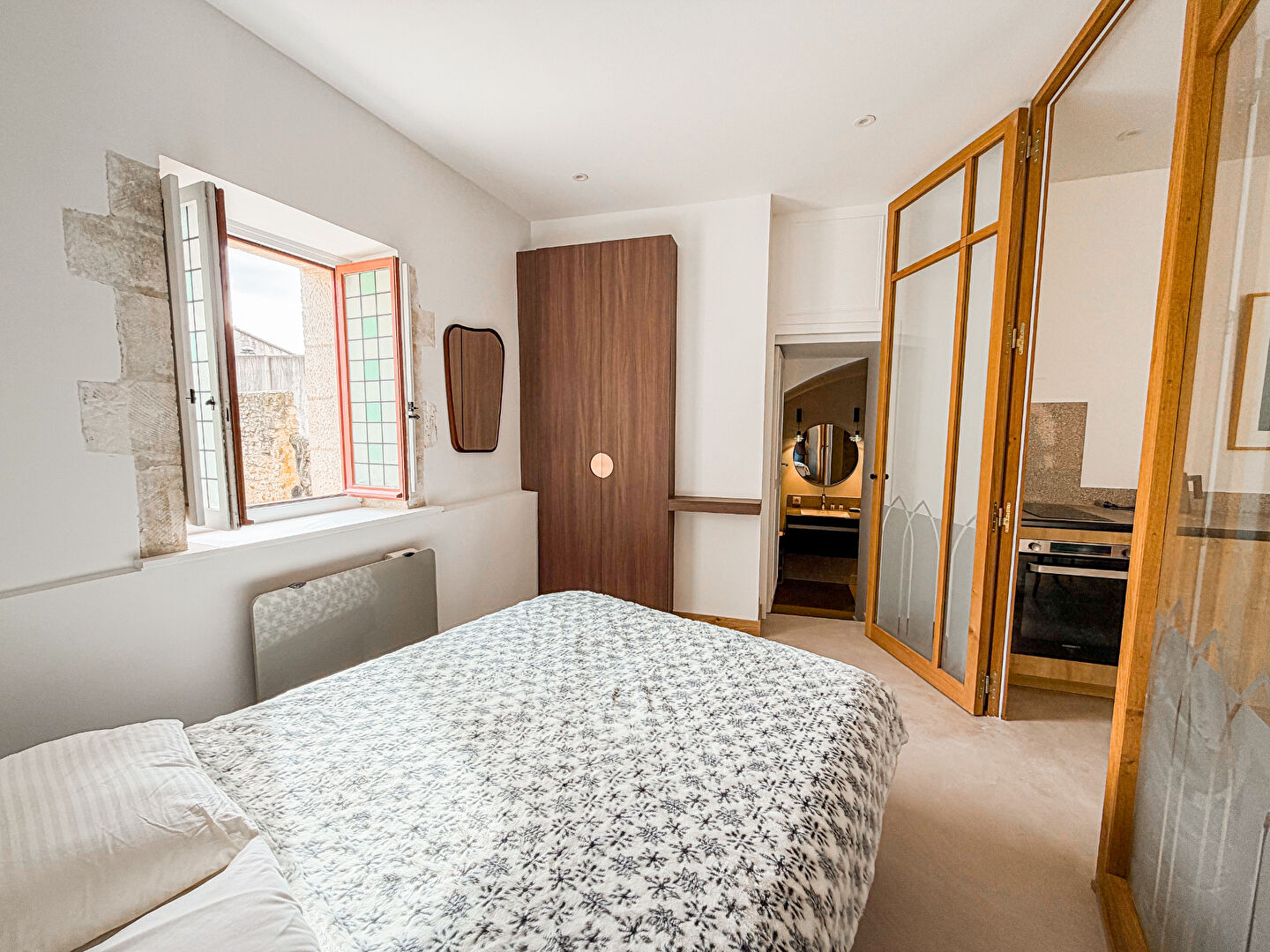 Niché au premier étage, l’appartement bénéficie d’une vue enchanteresse sur la très prisée place de l’Amirande et les toits pittoresques des alentours.