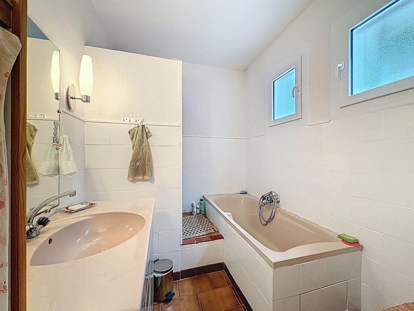 A l’étage, deux chambres, dont une avec terrasse, une salle d’eau avec WC et un grand grenier de 70 m² offrent de belles possibilités d’aménagement.