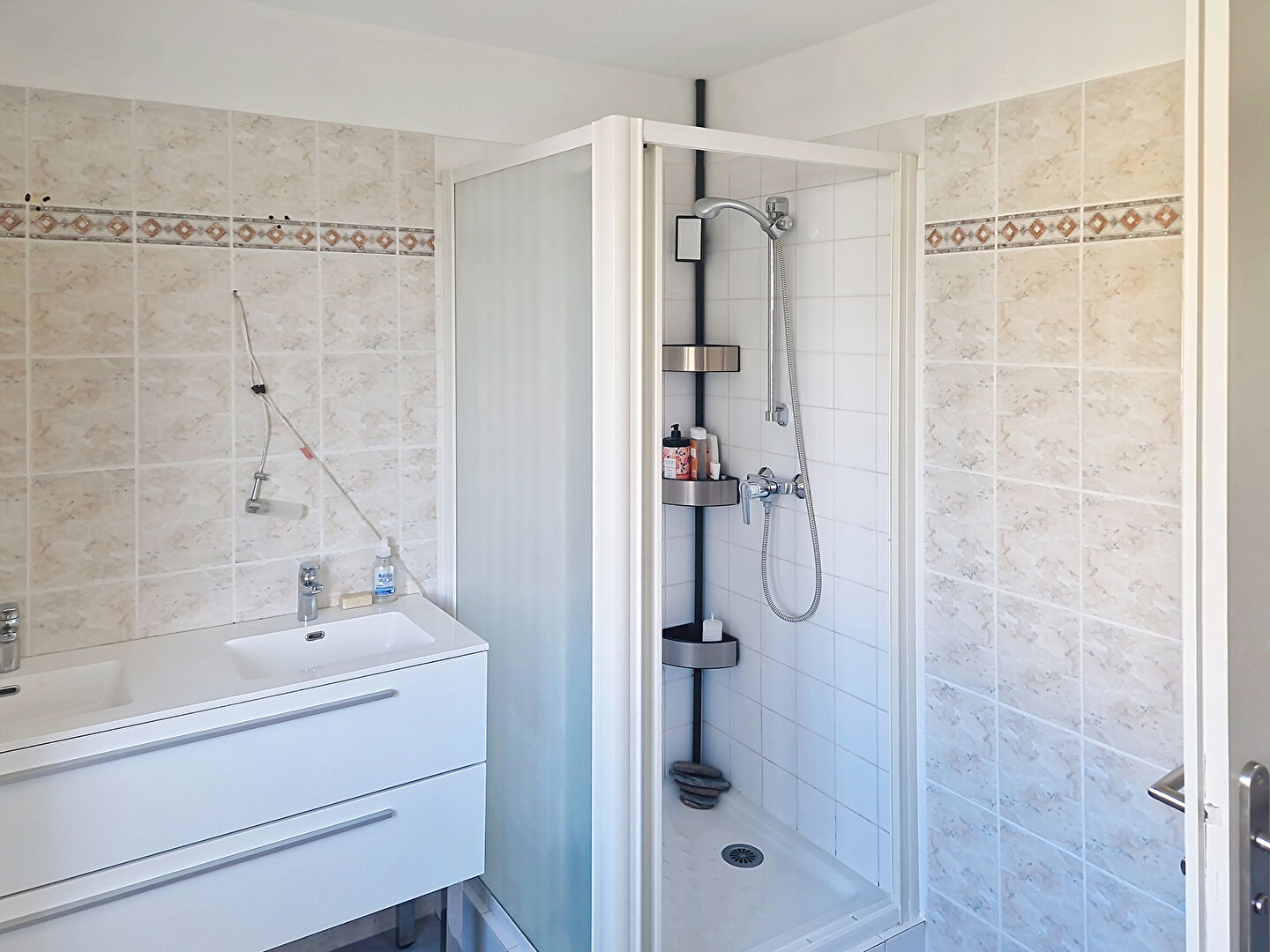 A l’étage, 3 chambres dont deux avec placards et une avec climatisation, salle d’eau, toilettes.