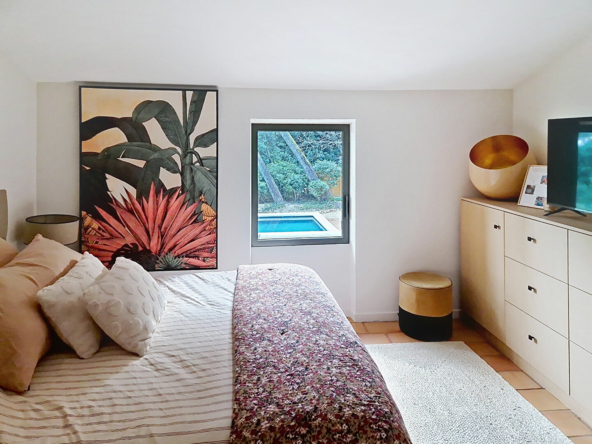 Le jardin arboré et sans vis-à-vis offre un cadre de vie paisible et agréable, agrémenté d’une piscine, tandis que l’intérieur bénéficie d’une climatisation complète, assurant un confort optimal en toute saison. L’extérieur dispose également d’un abri pour trois véhicules, idéal pour les familles.