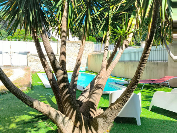 Jardin de 515 m², avec piscine, terrasses, et espaces de détente.